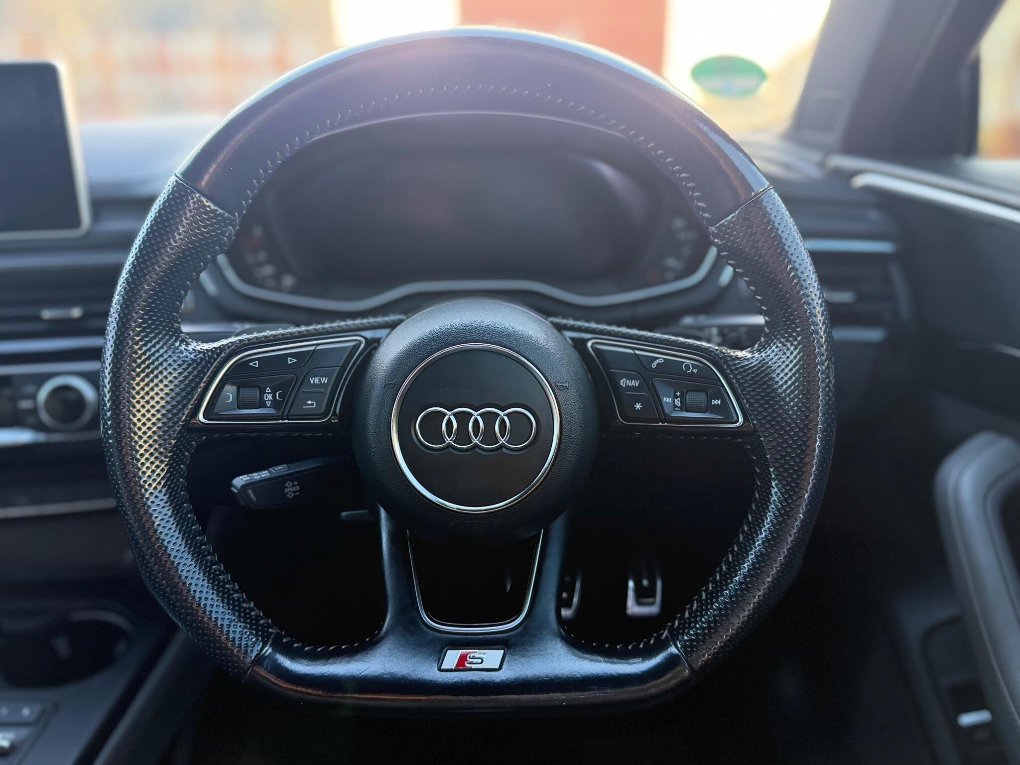 - UPGRADED FULL LEATHER FLAT BOTTOM S LINE SPORTS STEERING WHEEL (With perforated sides)